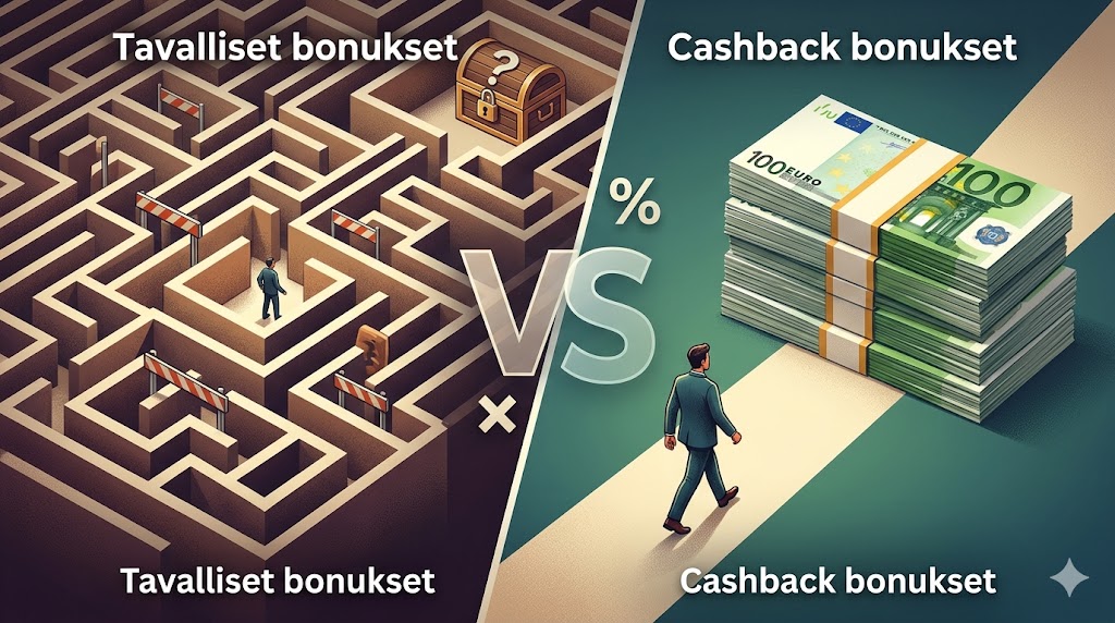 Vertaillessa sitä, miten cashback-bonukset toimivat suhteessa perinteisiin talletusbonuksiin, huomataan selkeitä eroja. Talletusbonus antaa pelaajalle enemmän pelirahaa heti alkuun, mikä kasvattaa mahdollisuuksia osua suureen voittoon suuremmalla alkusaldolla. Haittapuolena ovat usein raskaat kierrätysvaatimukset, jotka voivat ”lukita” omatkin rahat pitkäksi aikaa. Cashback taas ei auta alkusaldon kasvattamisessa, vaan se toimii jälkikäteen annettavana helpotuksena, jos onni ei ollut myötä.